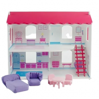 Собирается, как конструктор в пазы. Имеет 2 этажа, 4 комнаты, лестницуэ