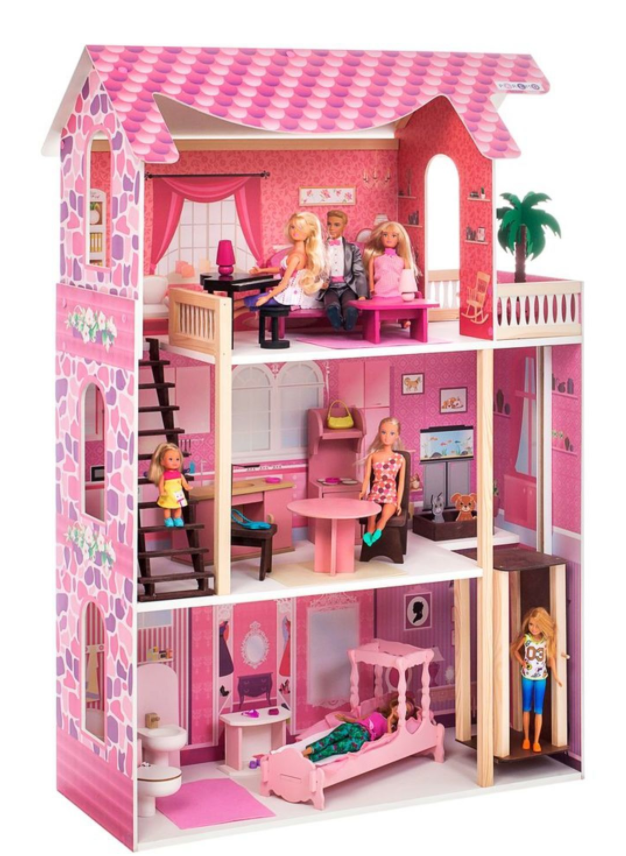 - Четырехэтажный кукольный домик с интерактивом; частично открытый.