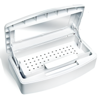 В нижний отсек бокса наливается дезинфицирующая жидкость, например, раствор Аламинола, на полочку с отверстиями кладутся инструменты.